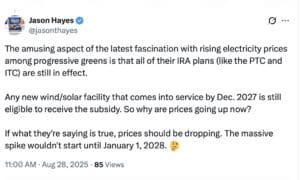 The oped does nod early on to the fact that “Electricity prices have leapt by 10% since January [2025].” They were leaping before that; rates have steadily increased as a result of the Obama-Biden “green energy” agenda (if much more earnestly after Biden’s “Inflation Reduction Act” passed). For these purposes, however, apparently that’s just factual clutter: the new administration was inaugurated in late January, so January 1 is your baseline. And Bob’s your Uncle.