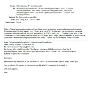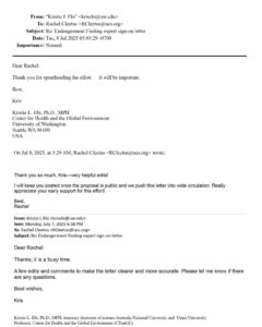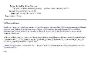 The larger production of correspondence of one reviewer using the resources of a public institution for her advocacy, NASEM EF reviewer Kristi Eli of the University of Washington, is here. Some samples below help illustrate the level of coordination on efforts to influence the EF and the public by ostensibly unbiased reviewers and some of the more strident activist groups and climate-plaintiffs’ witnesses.